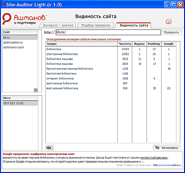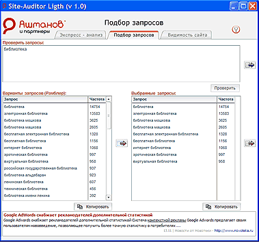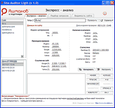 При помощи утилиты Site-Auditor Вы сможете быстро собрать данные, необходимые для оценки видимости сайта в Рунете.